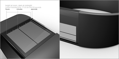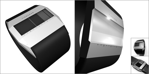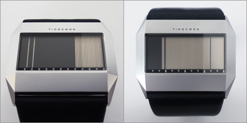 TIMECODE negotiates time in a highly visual display through which hours, minutes and seconds are represented by 60 vertical bars. Minutes and seconds are shown by single bars gliding from left to right, while the hours are shown by an array of bars. At midnight the watch is dark, yet it gets brighter and brighter with every passing hour, with the entire display finally being filled at noon. In the afternoon, the process reverses until a state of darkness is again reached at midnight. The digital display is embedded in an understated polygonal case.