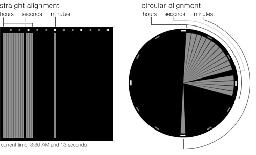 From the book “Grids for the Dynamic Image: “The original idea of this clock design is to communicate the transitions between day and night emotionally and rationally. Time units and the progress of time allocated a space which moves from left to right and from right to left according the progress of time. This means that you can always see how many hours and how many minutes are passed. And this concept fulfills the originally concept of distinguishing between day and night, because the whole space is black at night and white at midday.”